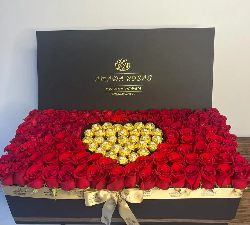 Caja corazón con 45 a 50 rosas premium más corazón ferrero Rocher con 8 chocolates: 330.500