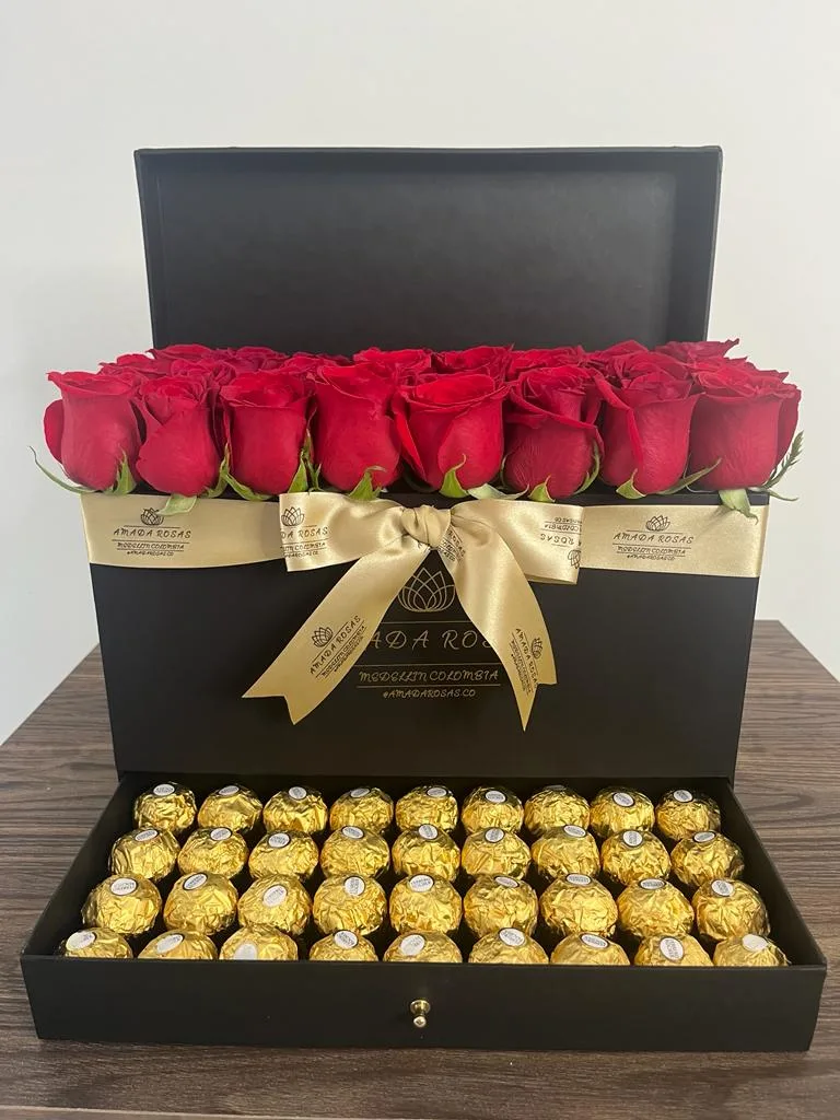 Caja cajonera con 32 rosas premium mas 36 chocolates ferrero rocher: 412.500