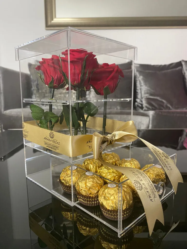 Caja acrilica con 4 rosas preservadas mas 9 ferrero roche:390.500