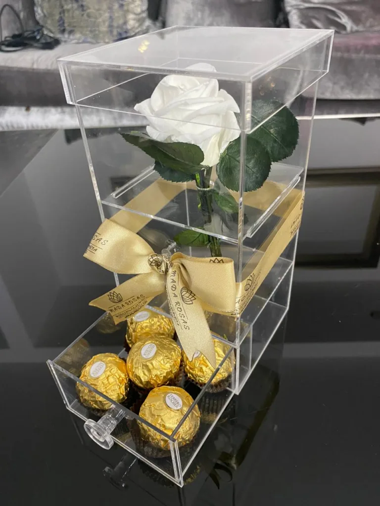 Caja acrilica con 1 rosa preservada mas 5 ferrero roche:263.500